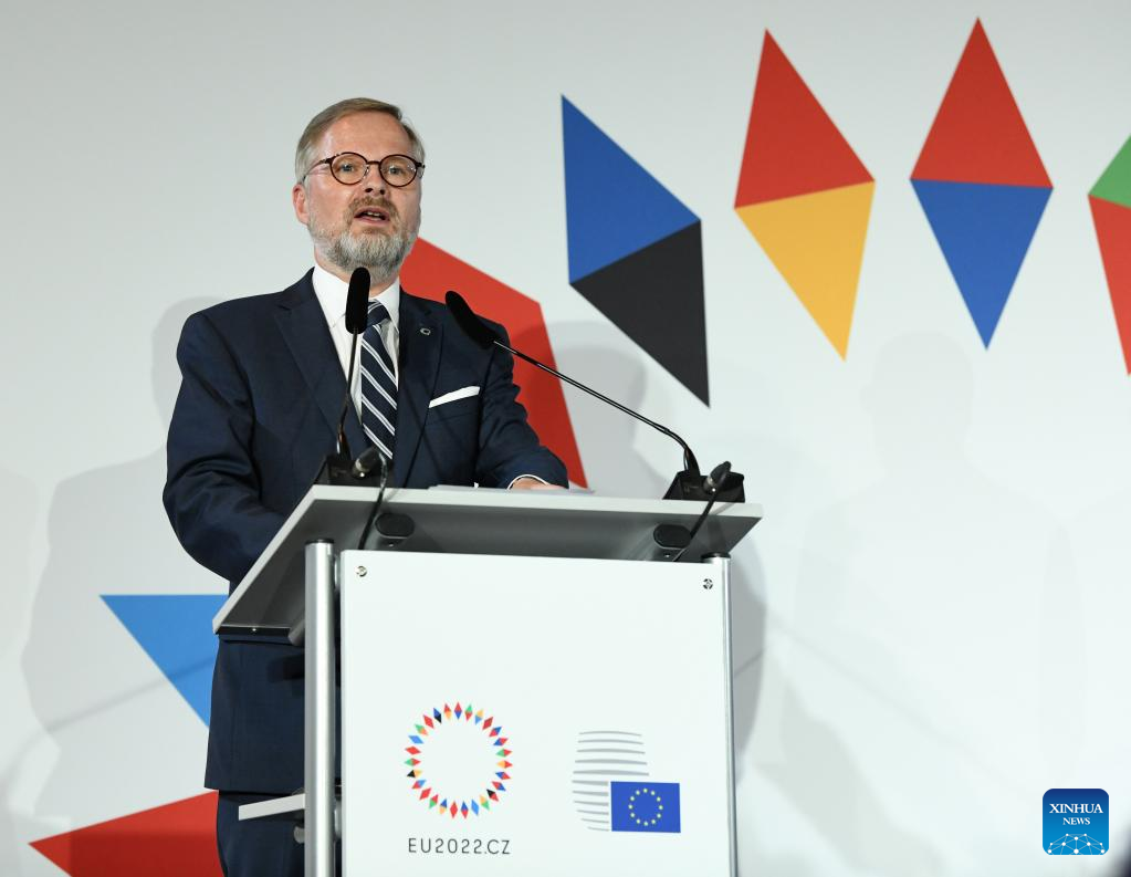 Czech Prime Minister Petr Fiala attends a press conference after an informal summit of the European Union (EU) in Prague, the Czech Republic, on Oct. 7, 2022. European Union (EU) leaders said on Friday at an informal summit here that they are still working on coordinated energy policies for the bloc's member states to address the energy crisis plaguing families and businesses. (Xinhua/Lian Yi)