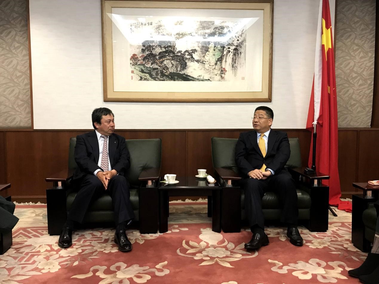 Then Chinese Consul-General in Japan's Osaka He Zhenliang (right) meets with Hiroaki Tsukamoto, president of Japanese company Tokai Lease Co., Ltd., Feb. 14, 2020. (Photo courtesy of the Chinese Consulate in Osaka)