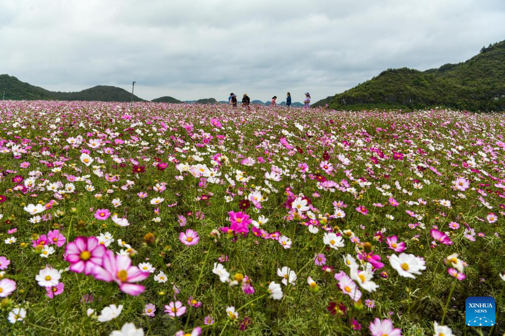 Tourists visit a flower field at a comprehensive agricultural base in Qiantao Township of Huaxi District, Guiyang, southwest China's Guizhou Province, Oct. 6, 2022. Great efforts have been made in recent years to develop agriculturally based tourism in Huaxi District of Guiyang. Under the rural vitalization drive, authorities have worked to improve infrastructure for rural tourism while encouraging industries with local features. (Xinhua/Yang Wenbin)