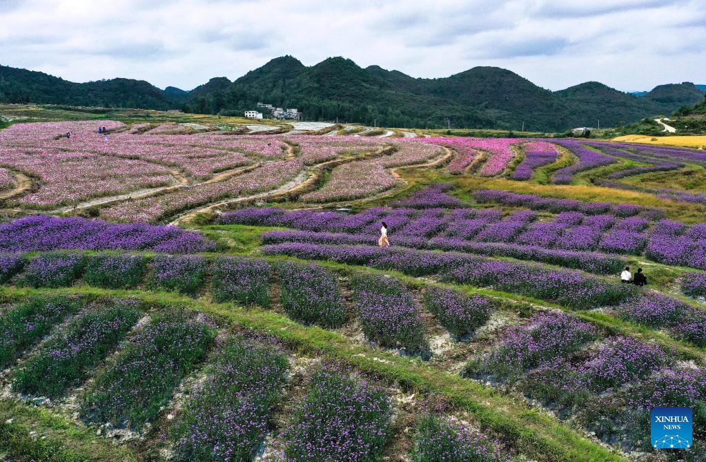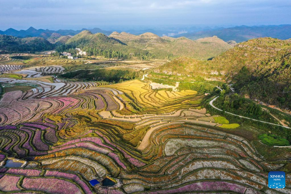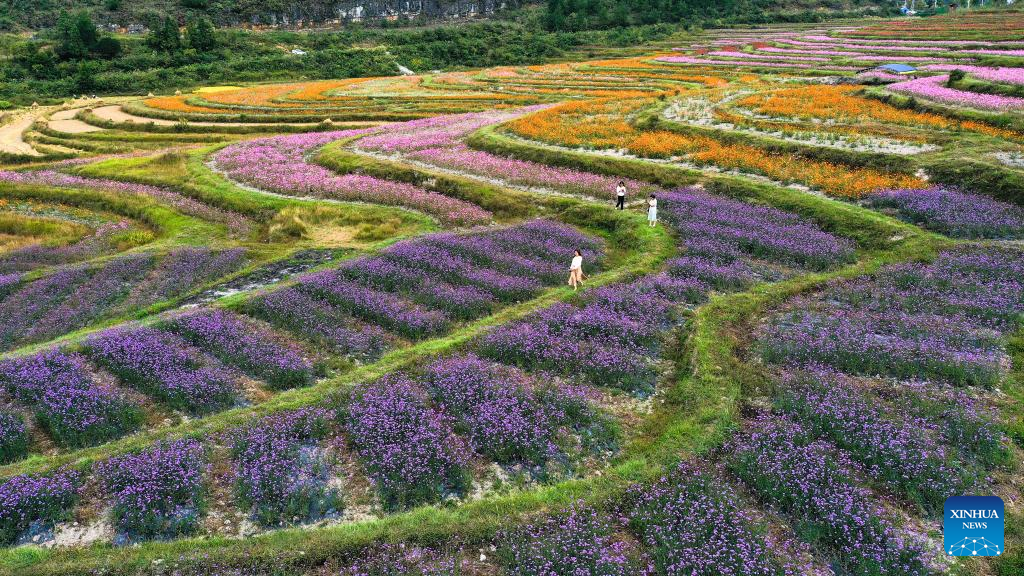 Aerial photo taken on Oct. 6, 2022 shows flowers at a comprehensive agricultural base in Qiantao Township of Huaxi District, Guiyang, southwest China's Guizhou Province. Great efforts have been made in recent years to develop agriculturally based tourism in Huaxi District of Guiyang. Under the rural vitalization drive, authorities have worked to improve infrastructure for rural tourism while encouraging industries with local features. (Xinhua/Yang Wenbin)