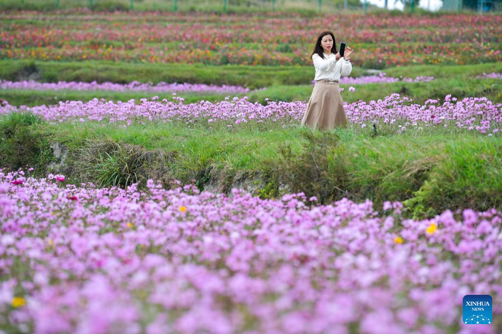 A tourist visits a flower field at a comprehensive agricultural base in Qiantao Township of Huaxi District, Guiyang, southwest China's Guizhou Province, Oct. 6, 2022. Great efforts have been made in recent years to develop agriculturally based tourism in Huaxi District of Guiyang. Under the rural vitalization drive, authorities have worked to improve infrastructure for rural tourism while encouraging industries with local features. (Xinhua/Yang Wenbin)