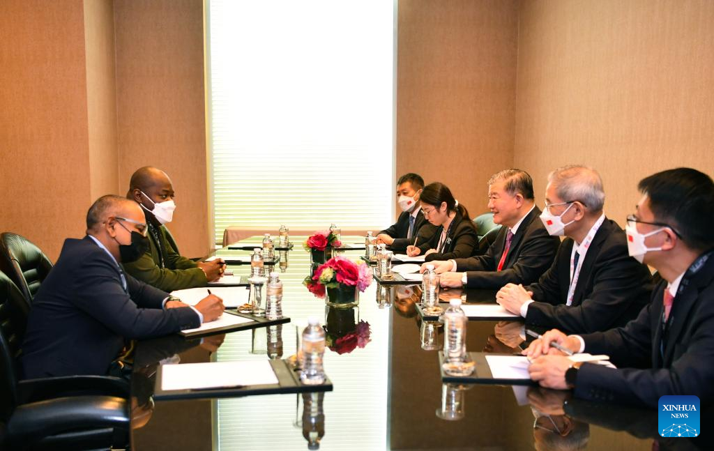 Chen Zhu (3rd R), vice chairman of China's National People's Congress Standing Committee, meets with Suriname's National Assembly Chairman Marinus Bee (2nd L) in Jakarta, Indonesia, Oct. 6, 2022. (Xinhua/Xu Qin)