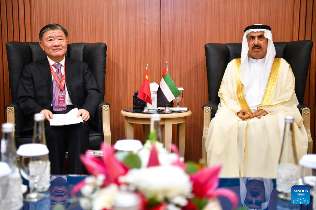Chen Zhu (L), vice chairman of China's National People's Congress Standing Committee, meets with Saqr Ghubash, speaker of the Federal National Council of the United Arab Emirates (UAE), in Jakarta, Indonesia, Oct. 5, 2022. (Xinhua/Xu Qin)