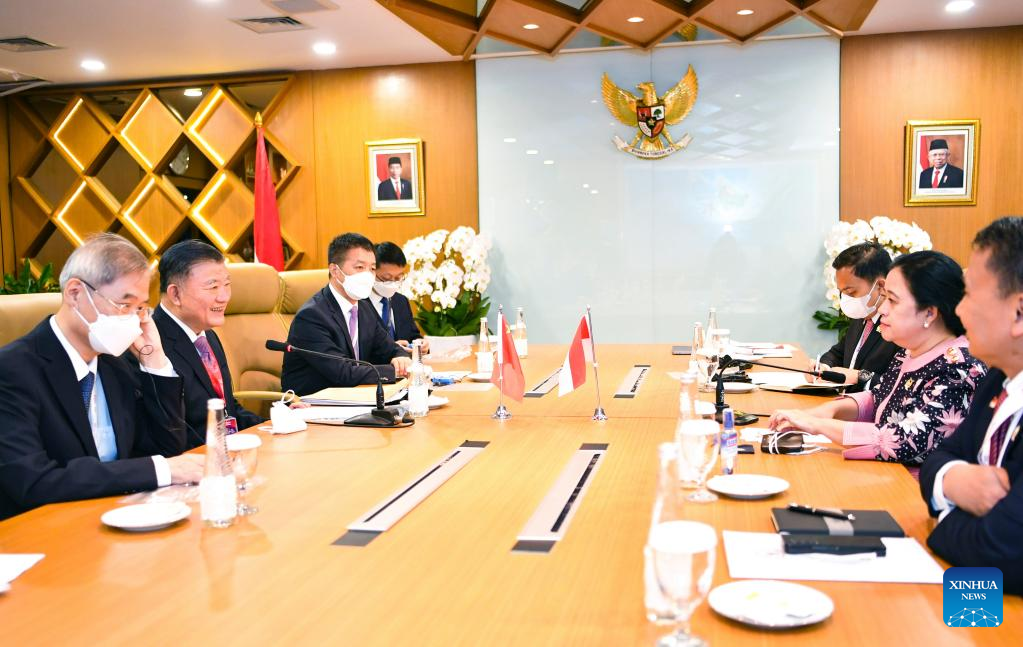 Chen Zhu (2nd L), vice chairman of China's National People's Congress Standing Committee, meets with Indonesia's House of Representatives' Speaker Puan Maharani (2nd R) in Jakarta, Indonesia, Oct. 5, 2022. (Xinhua/Xu Qin)