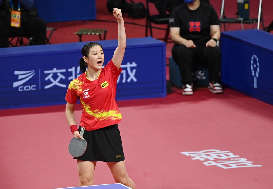 Chen Meng of China celebrates scoring against Miyuu Kihara of Japan during the women's teams final match. (Xinhua/Xu Bingjie)