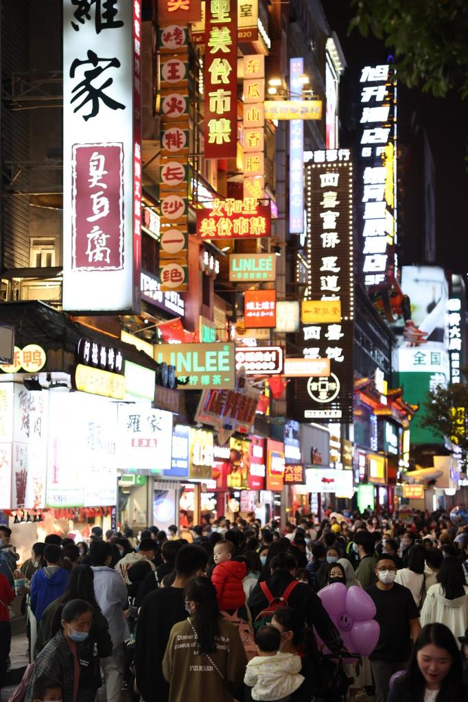 Tourists have fun on the Huangxing Road pedestrian street in Changsha, central China's Hunan Province, Oct. 5, 2022. (Xinhua/Xue Yuge)