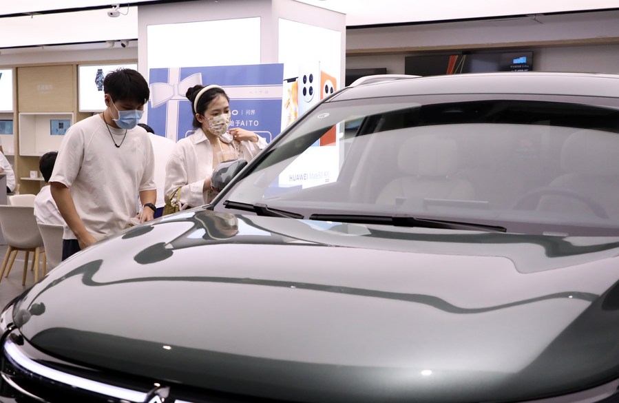 Customers look at a new energy vehicle at a shopping mall in the Tianhe Road shopping area of Guangzhou, south China's Guangdong Province, Oct. 6, 2022. (Xinhua/Huang Guobao)