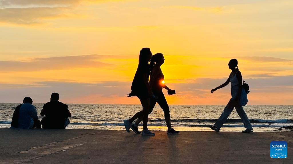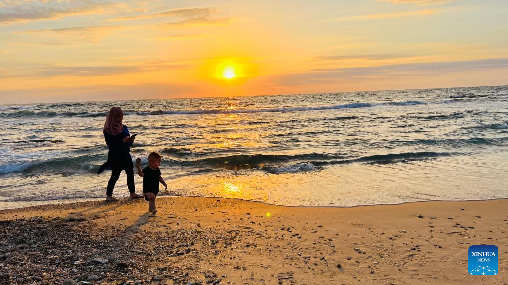 People enjoy the sunset over the Mediterranean Sea in Tel Aviv, Israel, on Oct. 7, 2022. (Photo by Muammar Awad/Xinhua)