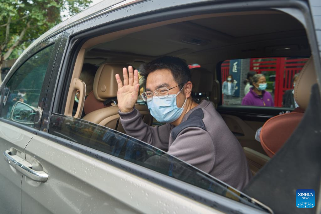 Gan Yu waves goodbye to people seeing him off at West China Hospital of Sichuan University in Chengdu, southwest China's Sichuan Province, Oct. 8, 2022.