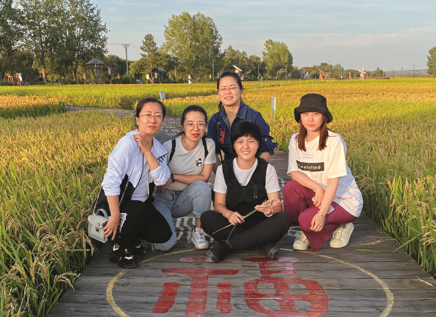 Chen Yujia poses for a picture with her partners in a rice field. (Photo/Women of China magazine)