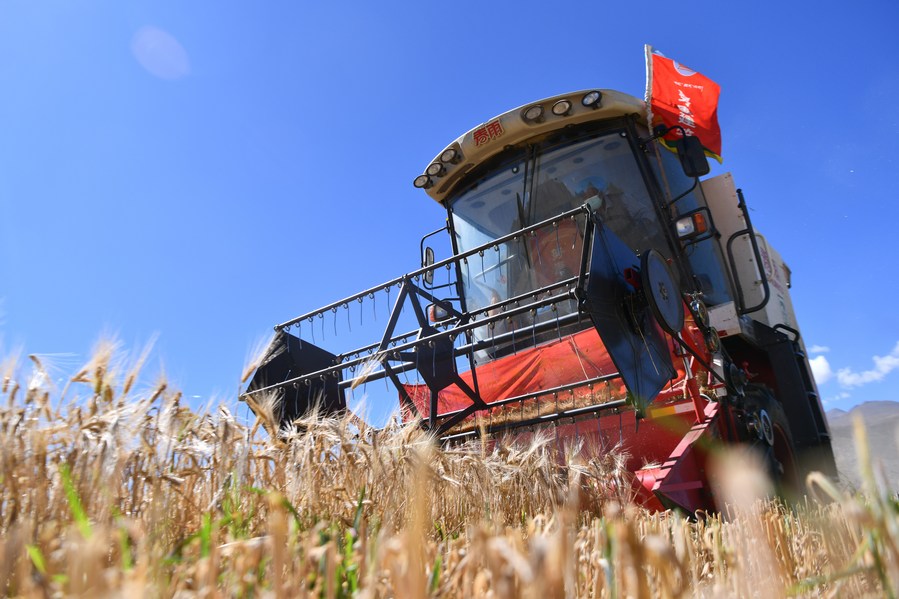A harvester operates in a highland barley field in Rasog Township of Gyangze County, Xigaze, southwest China's Tibet Autonomous Region, Sept. 19, 2022. (Xinhua/Jigme Dorje)