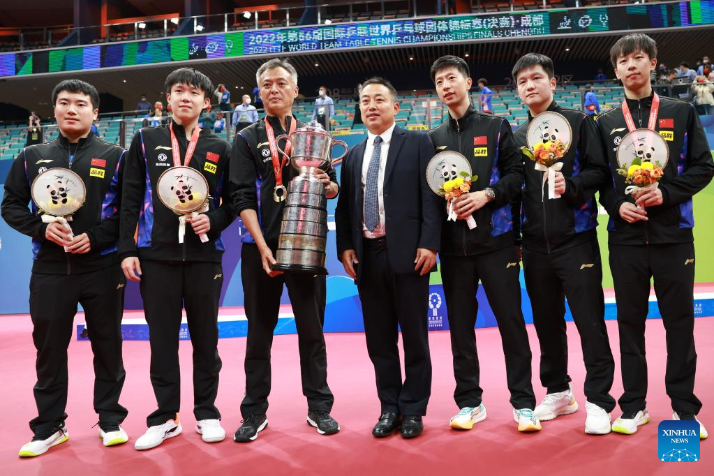 Members of China and president of Chinese Table Tennis Association (CTTA) Liu Guoliang (4th R) pose with trophy during the awarding ceremony after the men's teams final match against Germany at the 2022 ITTF World Team Table Tennis Championships Finals in Chengdu, southwest China's Sichuan Province, Oct. 9, 2022. (Xinhua/Liu Xu)