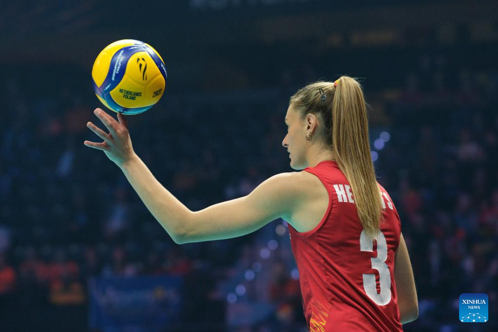 Britt Herbots of Belgium prepares to serve the ball during the Phase 2 Pool E match between China and Belgium at the 2022 Volleyball Women's World Championship in Rotterdam, the Netherlands, Oct. 9, 2022. (Xinhua/Meng Dingbo)