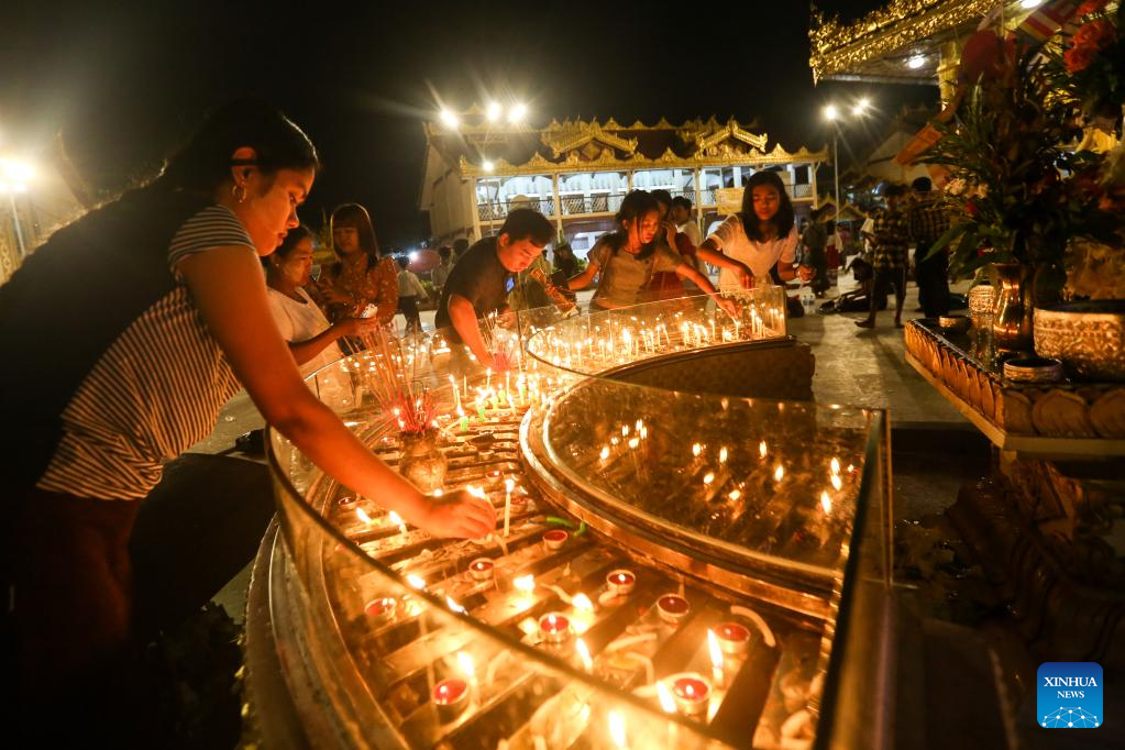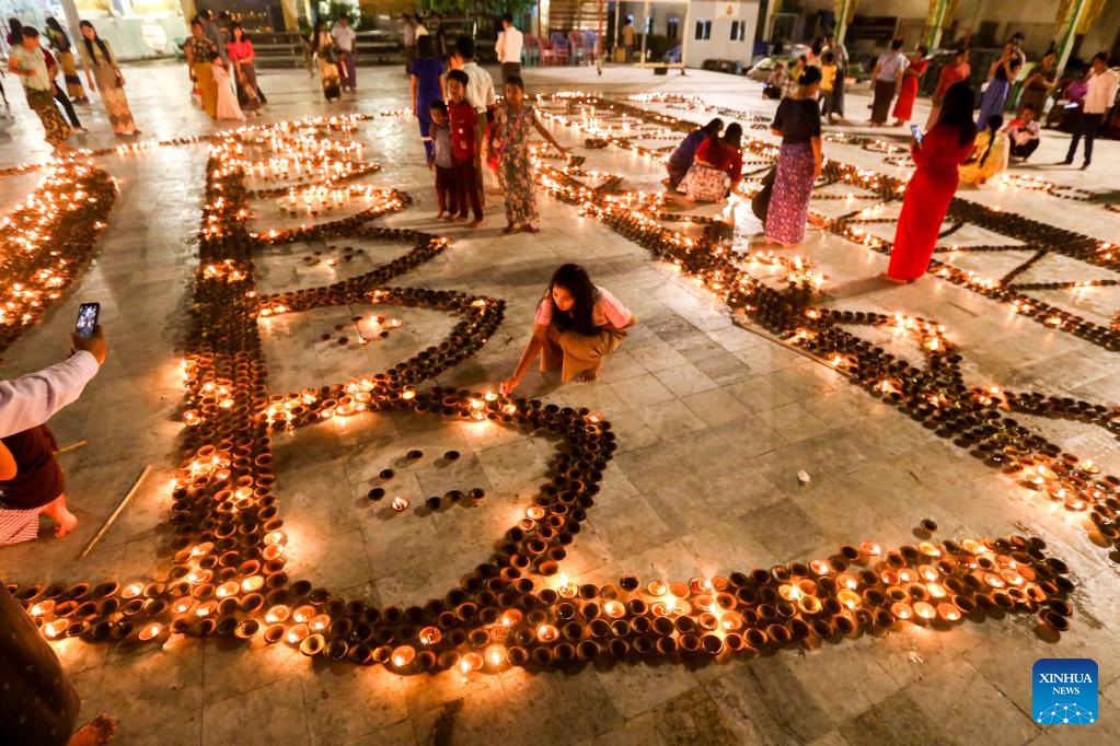 People light candles on the full moon day of Thadingyut lighting festival in Yangon, Myanmar, Oct. 9, 2022. (Photo by Myo Kyaw Soe/Xinhua)