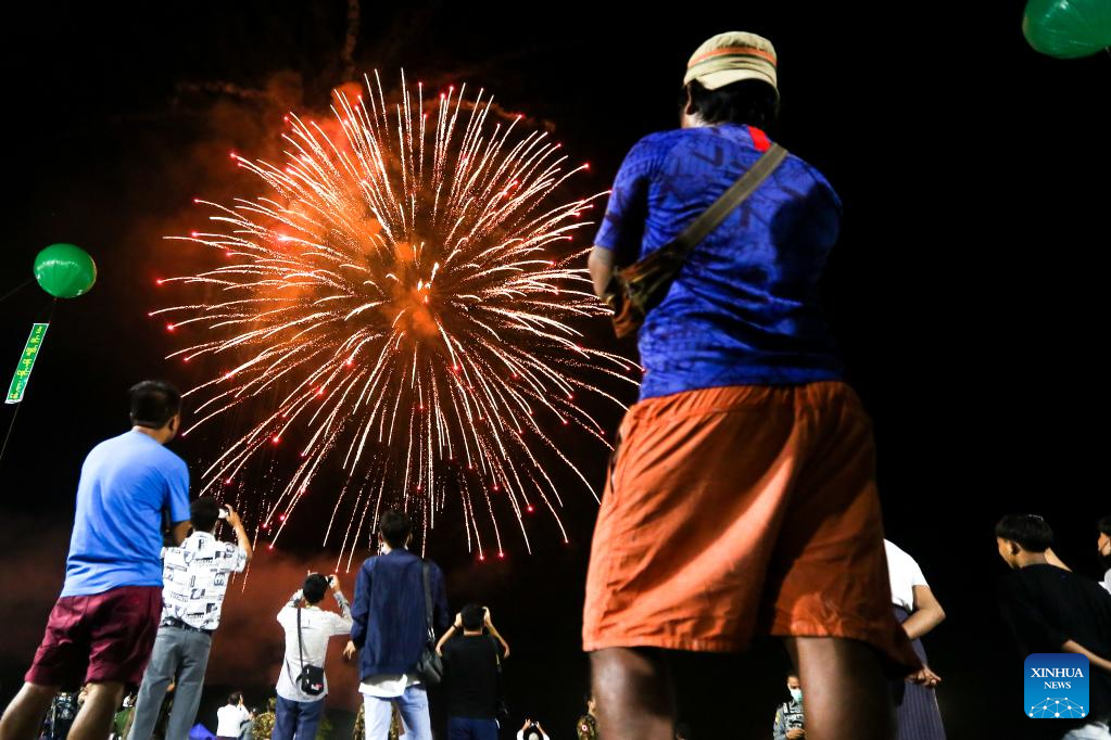People watch a firework show during the Thadingyut lighting festival in Yangon, Myanmar, Oct. 9, 2022. (Photo by Myo Kyaw Soe/Xinhua)