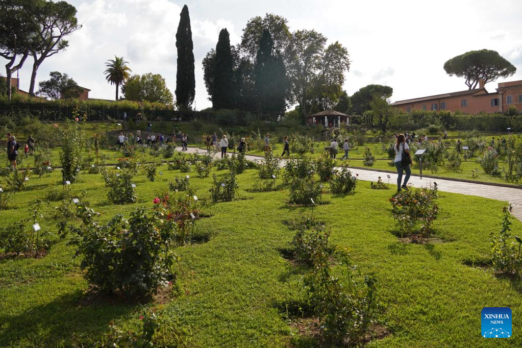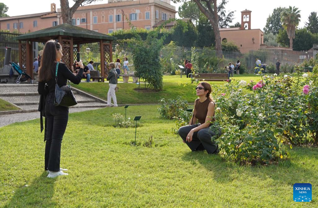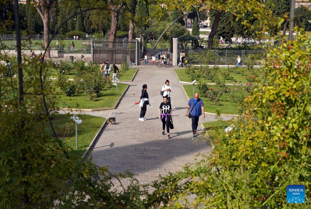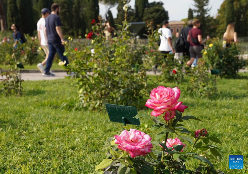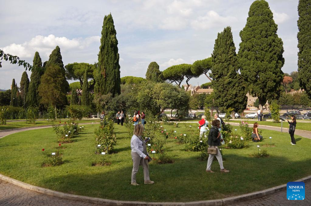 People visit the Rome Rose Garden in Rome, Italy, on Oct. 9, 2022. The Rome Rose Garden opened to the public on Saturday. (Xinhua/Jin Mamengni)