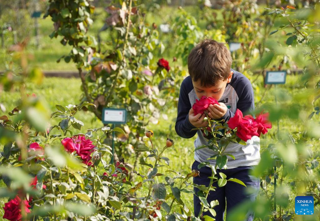 A child smells a flower at the Rome Rose Garden in Rome, Italy, on Oct. 9, 2022. The Rome Rose Garden opened to the public on Saturday. (Xinhua/Jin Mamengni)