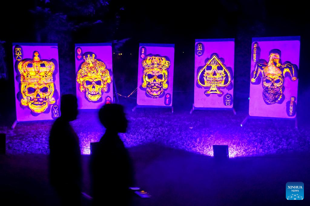 People look at the illuminated pumpkin installations at the Pumpkins After Dark event in Burnaby, Canada, on Oct. 9, 2022. The outdoor walk-through event features illuminated pumpkin sculptures and displays built by over 6,000 handcrafted pumpkins, together with music, sounds, and special effects. (Photo by Liang Sen/Xinhua)