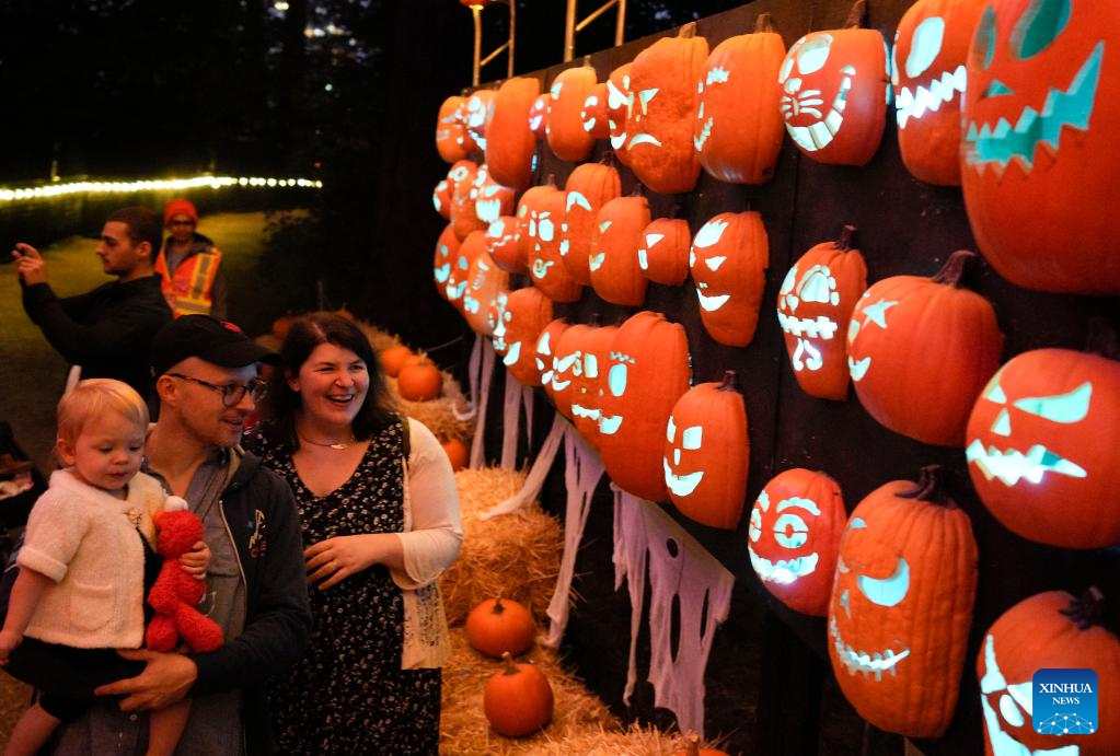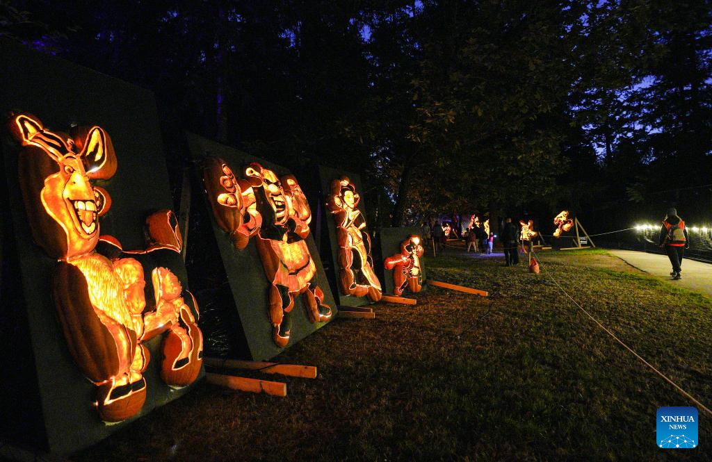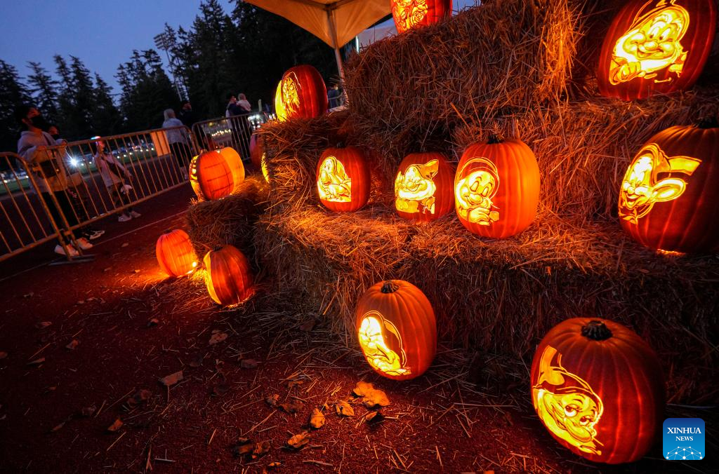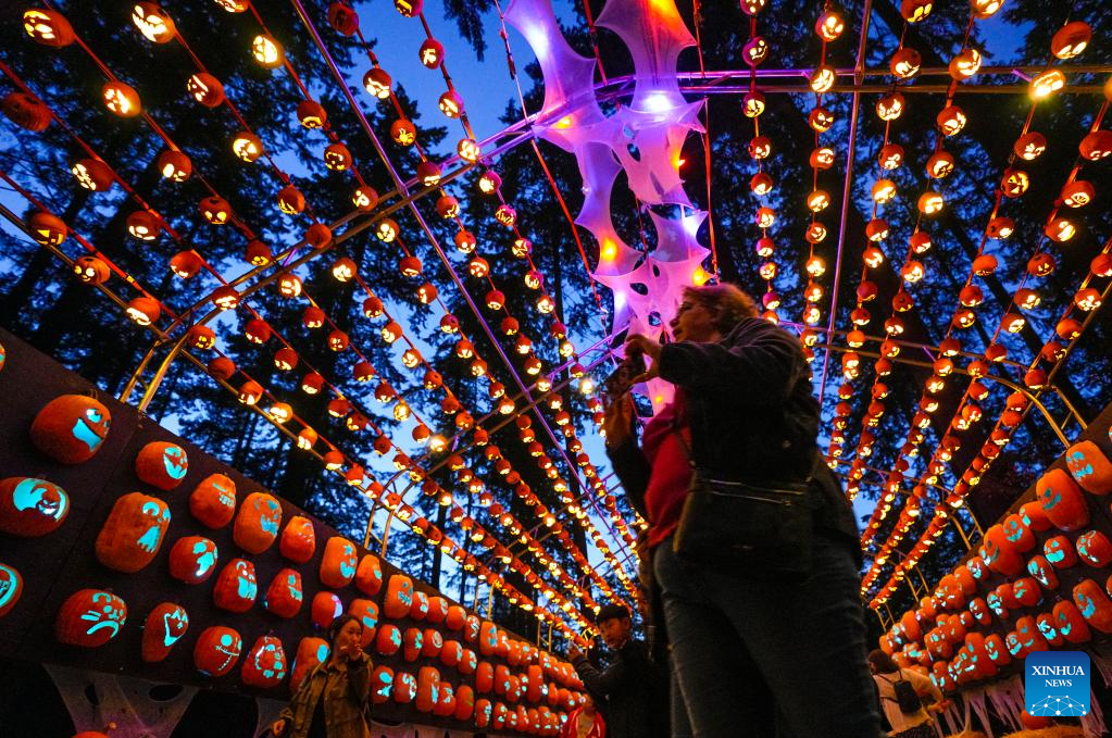 Illuminated pumpkin carvings are seen at the Pumpkins After Dark event in Burnaby, Canada, on Oct. 9, 2022. The outdoor walk-through event features illuminated pumpkin sculptures and displays built by over 6,000 handcrafted pumpkins, together with music, sounds, and special effects. (Photo by Liang Sen/Xinhua)