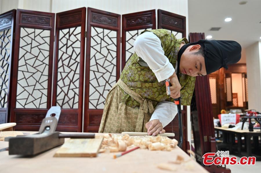 A team member makes wooden clogs in a studio in Nanning, south China's Guangxi Zhuang Autonomous Region, Oct. 9, 2022. (Photo: China News Service/Yu Jing)