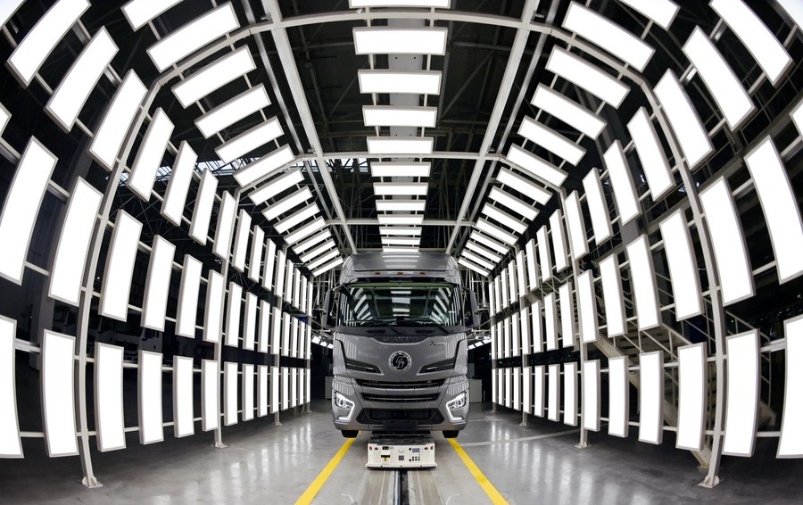 A heavy truck undergoes a test on the assembly line of the heavy truck capacity expansion project at the Shaanxi Automobile Holding Group in Xi'an, northwest China's Shaanxi Province, Sept. 27, 2022. (Xinhua/Liu Xiao)