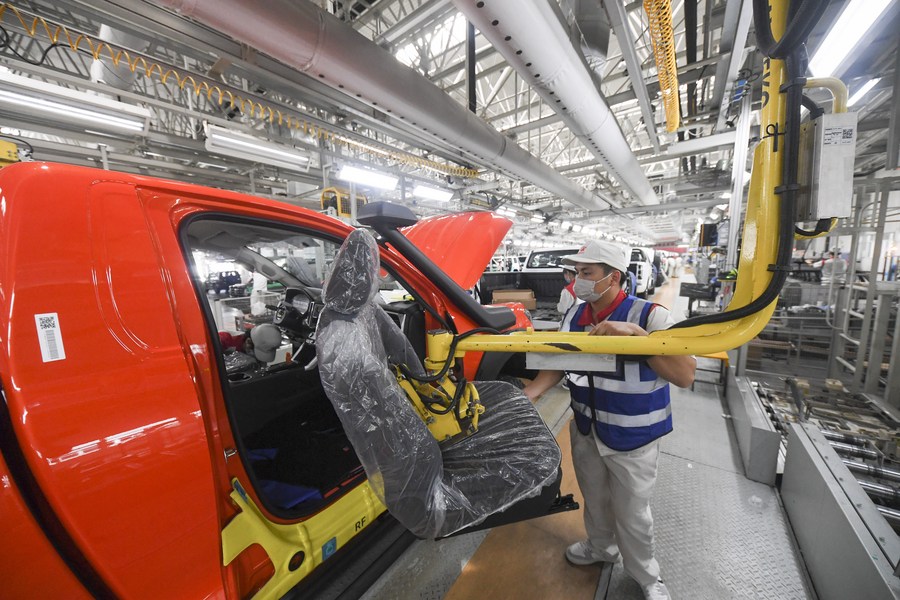 Workers operate at an intelligent production base of the Great Wall Motors in Yongchuan District of Chongqing, southwest China, Sept. 22, 2022. (Xinhua/Wang Quanchao)