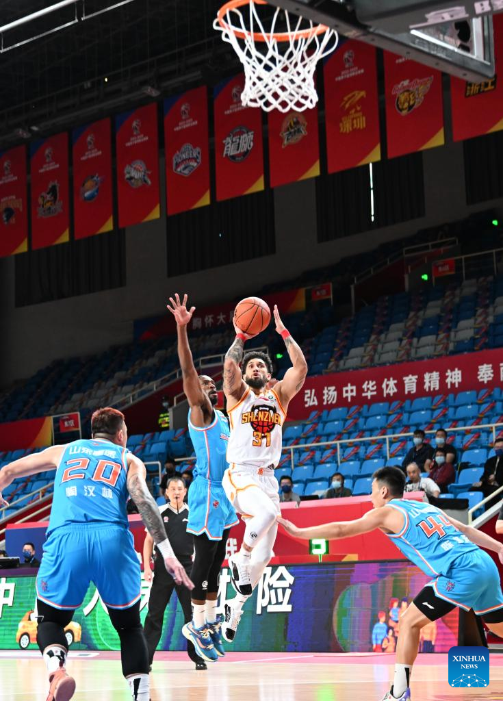Askia Booker (2nd R) of Shenzhen Leopards shoots during the 1st round match between Shenzhen Leopards and Shandong Heroes at the 2022-2023 season of the Chinese Basketball Association (CBA) league in Hangzhou, east China's Zhejiang Province, Oct. 10, 2022. (Xinhua/Chen Zhenhai)