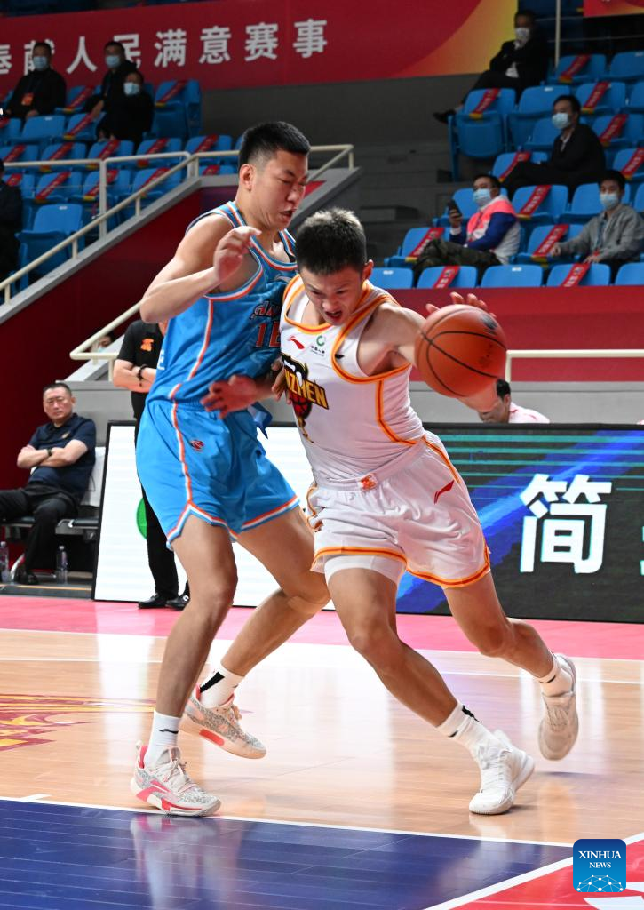 Zhou Peng (R) of Shenzhen Leopards breaks through during the 1st round match between Shenzhen Leopards and Shandong Heroes at the 2022-2023 season of the Chinese Basketball Association (CBA) league in Hangzhou, east China's Zhejiang Province, Oct. 10, 2022. (Xinhua/Chen Zhenhai)