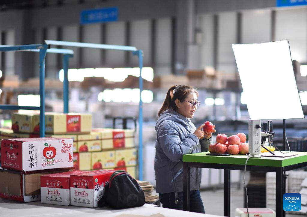 A staff member promotes apples via livestreaming at a warehouse in Luochuan County, northwest China's Shaanxi Province, Oct. 10, 2022. (Xinhua/Zhang Bowen)