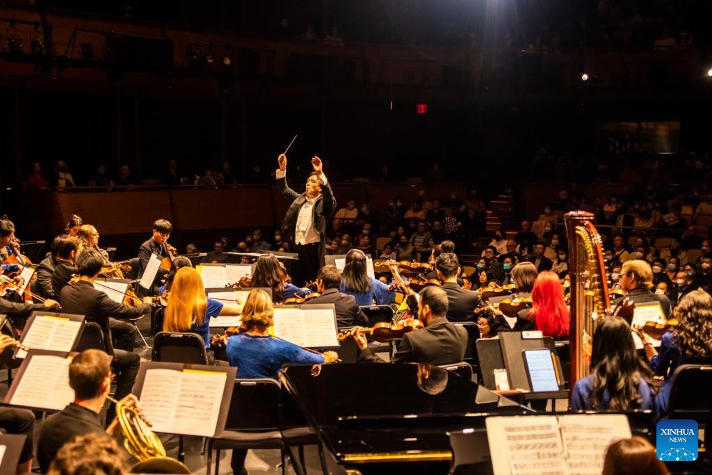 Jindong Cai (C), director of the U.S.-China Music Institute, conducts at the concert "Tales from Beijing" of China Now Music Festival at the Lincoln Center in New York, the United States, on Oct. 9, 2022. China Now Music Festival, a leading force in introducing music from China to the United States, kicked off its fifth season on Sunday at the Lincoln Center in New York City, with fusion music works that "belong to both East and West." (Photo by Winston Zhou/Xinhua)