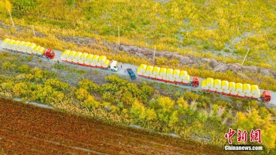 Cotton trucks line up in a field in Karamay, northwest China's Xinjiang Uygur Autonomous Region. (Photo: China News Service/Min Yong)