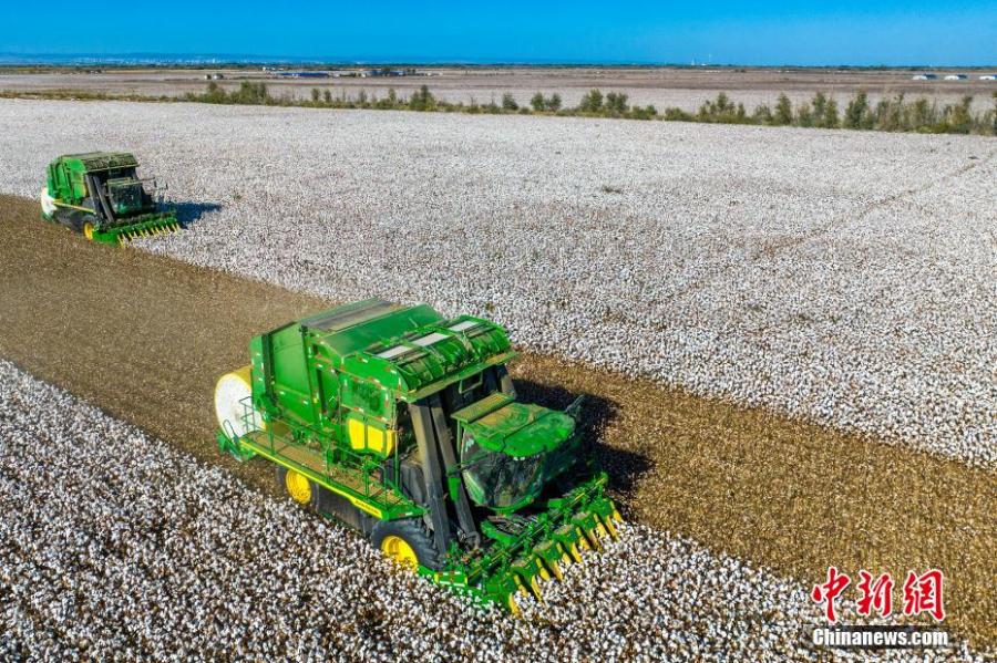 Cotton pickers harvest cotton in a field in Karamay, northwest China's Xinjiang Uygur Autonomous Region. (Photo: China News Service/Min Yong)