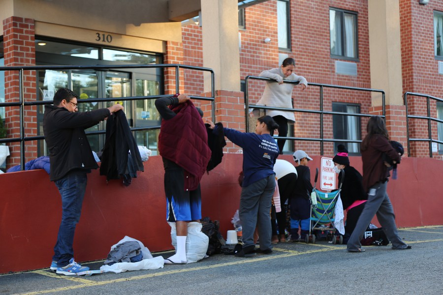Antonio Ovando (1st L), an asylum seeker who arrived in New York City less than a week ago, picks up clothes dropped off by New Yorkers outside a hotel in Staten Island, New York, the United States, on Oct. 9, 2022. (Xinhua/Liu Yanan)