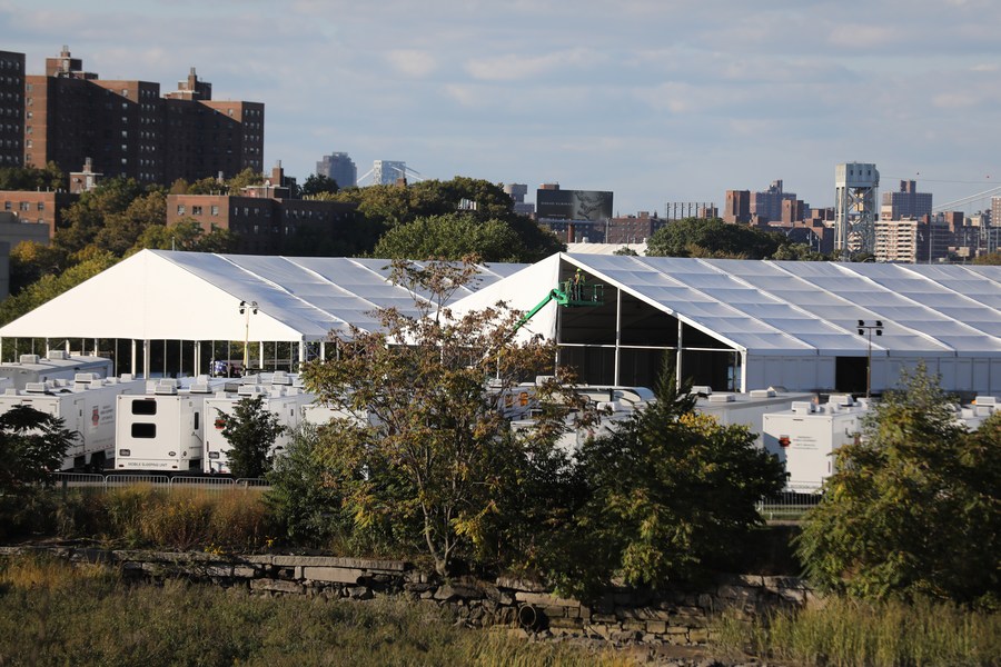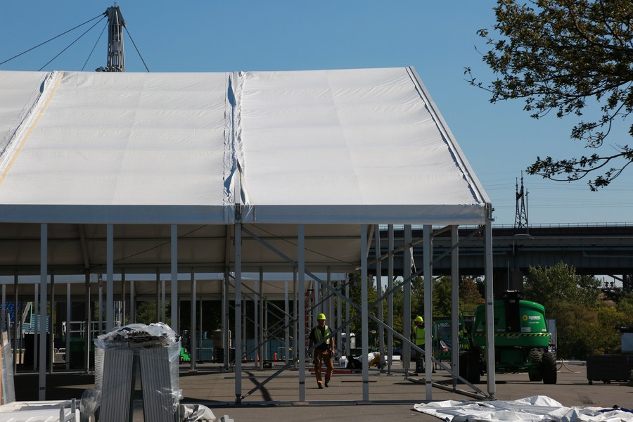 Photo shows the construction site of a humanitarian emergency response and relief center for asylum seekers in Randall's Island in New York, the United States, Oct. 9, 2022. (Xinhua/Wang Ying)