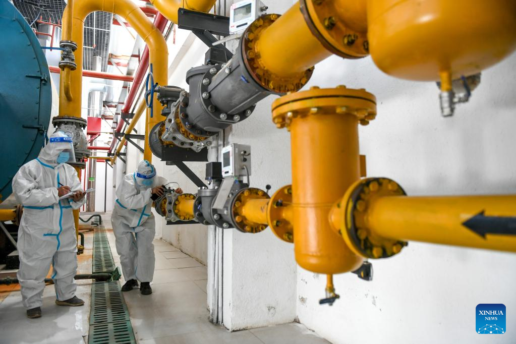 Workers check gas pipelines at a heating company in Hohhot, north China's Inner Mongolia Autonomous Region, Oct. 10, 2022. Heating supply starts earlier this year as a response to deal with a sharp drop in temperature in Hohhot. (Xinhua/Bei He)