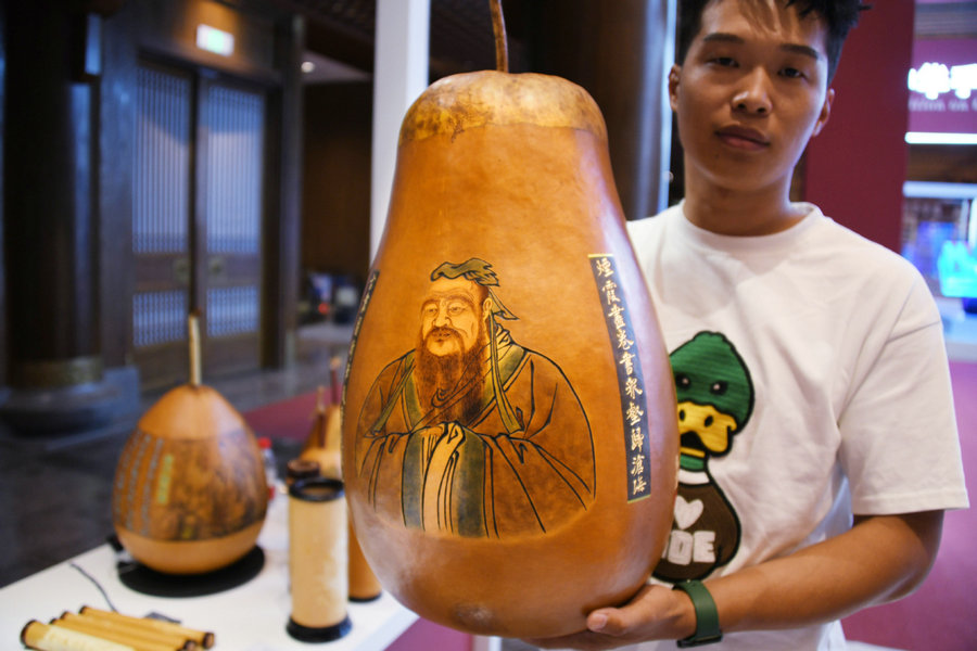 Jia Fei, an intangible cultural heritage inheritor of gourd pyrography, showcases his pyrograph work of Confucius on Sept 26, 2022. [Photo/Xinhua]