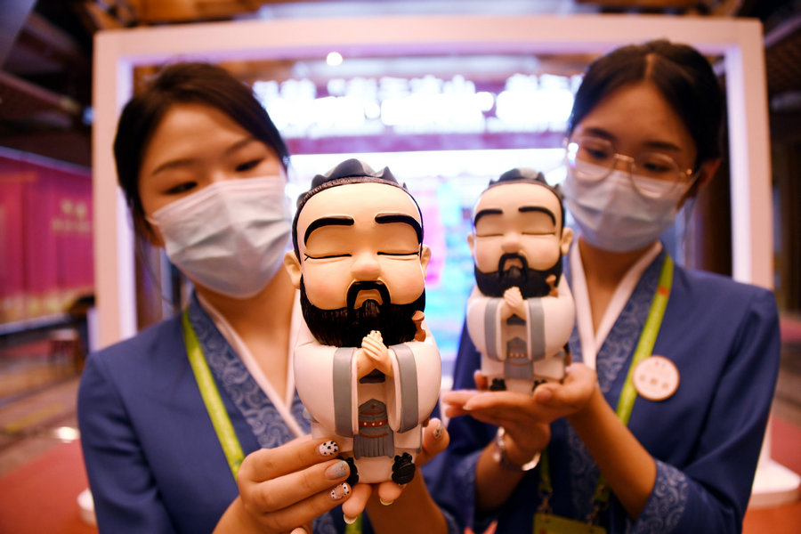 Two volunteers at the exhibition show two cultural and creative products of Confucius on Sept 26, 2022. [Photo/Xinhua]