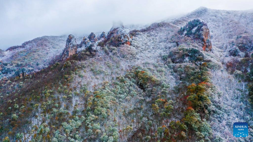 Aerial photo taken on Oct. 10, 2022 shows a view of Tianqiaogou forest park after snow in Dandong, northeast China's Liaoning Province. (Photo by Zhang Xiaoqiang/Xinhua)