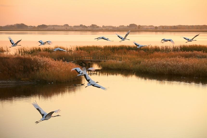 Red-crowned cranes fly at Zhalong National Nature Reserve in northeast China's Heilongjiang Province.