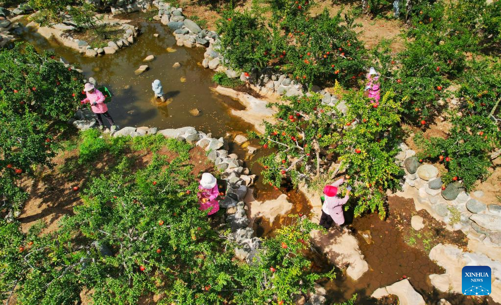 Aerial photo taken on Oct. 9, 2022 shows villagers harvesting pomegranates in an orchard in Liuyuan Town of Yicheng District in Zaozhuang City, east China's Shandong Province. Villagers are busy harvesting and trading pomegranates recently in Liuyuan, a town famous for producing pomegranates. (Xinhua/Fan Changguo)