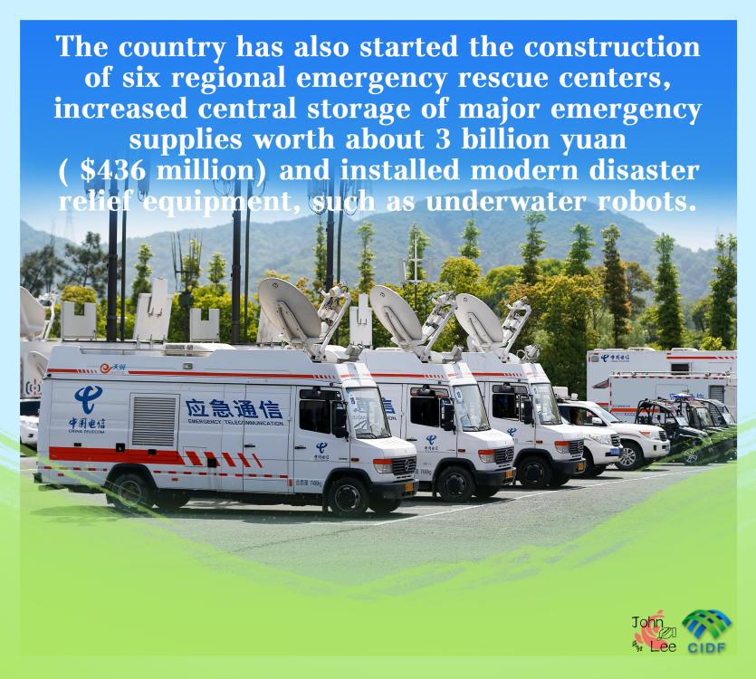 The country has also started the construction of six regional emergency rescue centers, increased central storage of major emergency supplies worth about 3 billion yuan (about $436 million) and installed modern disaster relief equipment, such as underwater robots.