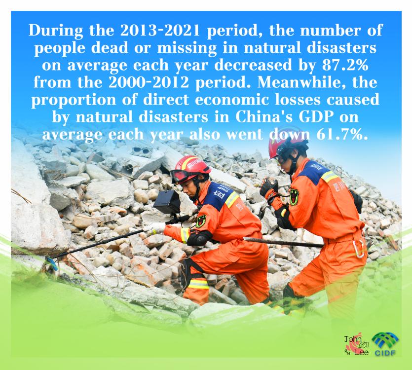 During the 2013-2021 period, the number of people dead or missing in natural disasters on average each year decreased by 87.2% from the 2000-2012 period. Meanwhile, the proportion of direct economic losses caused by natural disasters in China's GDP on average each year also went down 61.7%.