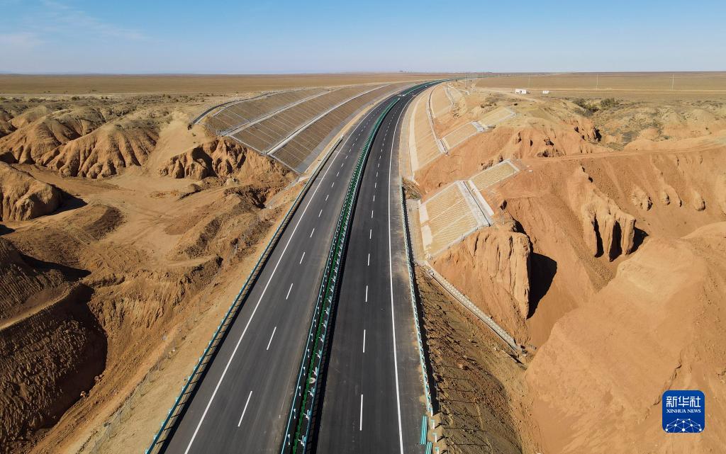 Aerial photo taken on Oct. 10, 2021, shows a section of the Altay-Urumqi Expressway running through the Gurbantunggut Desert, the second-largest desert in China, in northwest China's Xinjiang Uygur Autonomous Region. (Photo courtesy of the Transport Department of Xinjiang)