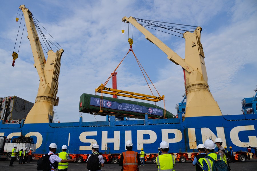 Photo taken on Aug. 18, 2022 shows a high-speed electric passenger train, customized for the Jakarta-Bandung high-speed railway, being loaded on a vessel in Qingdao Port of east China's Shandong province. (Photo by Jiang Chao/Xinhua)