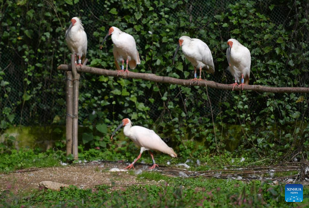 Crested ibises are seen at a crested ibis feralization base in Ningshan County of northwest China's Shaanxi Province, Oct. 10, 2022. In recent years, Ningshan County has made great efforts in ecological protection and green development, with local forest coverage rate reaching 96.24 percent and the population of crested ibises, giant pandas and golden snub-nosed monkeys growing. (Xinhua/Shao Rui)