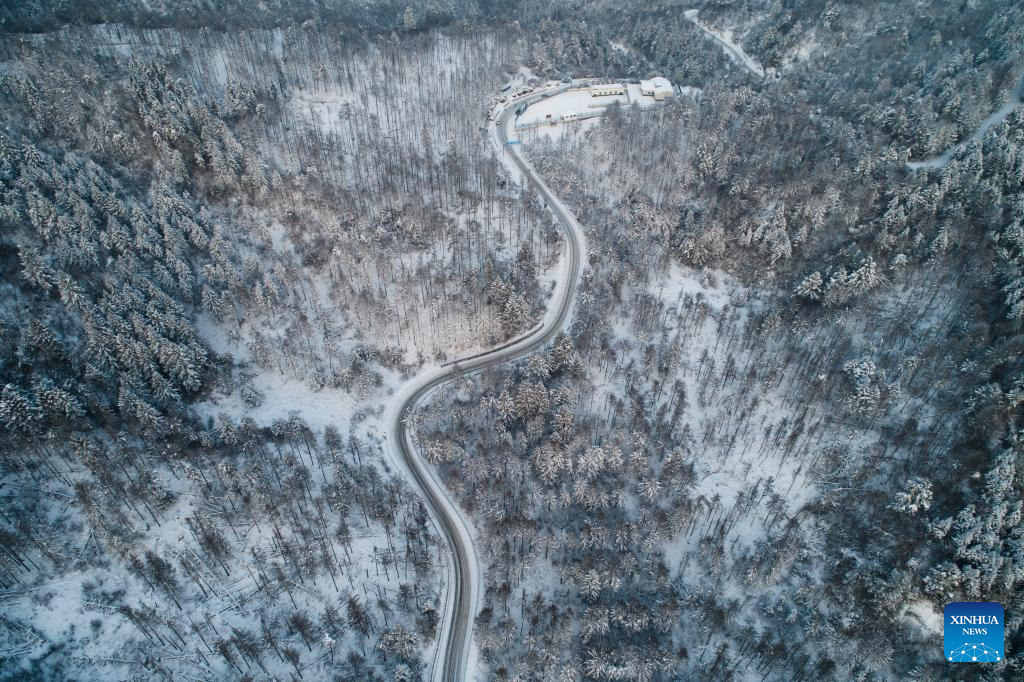 Aerial photo taken on Feb. 7, 2022 shows the scenery of Pinghe ridge of Qinling Mountains in Ningshan County, northwest China's Shaanxi Province. In recent years, Ningshan County has made great efforts in ecological protection and green development, with local forest coverage rate reaching 96.24 percent and the population of crested ibises, giant pandas and golden snub-nosed monkeys growing. (Xinhua/Shao Rui)