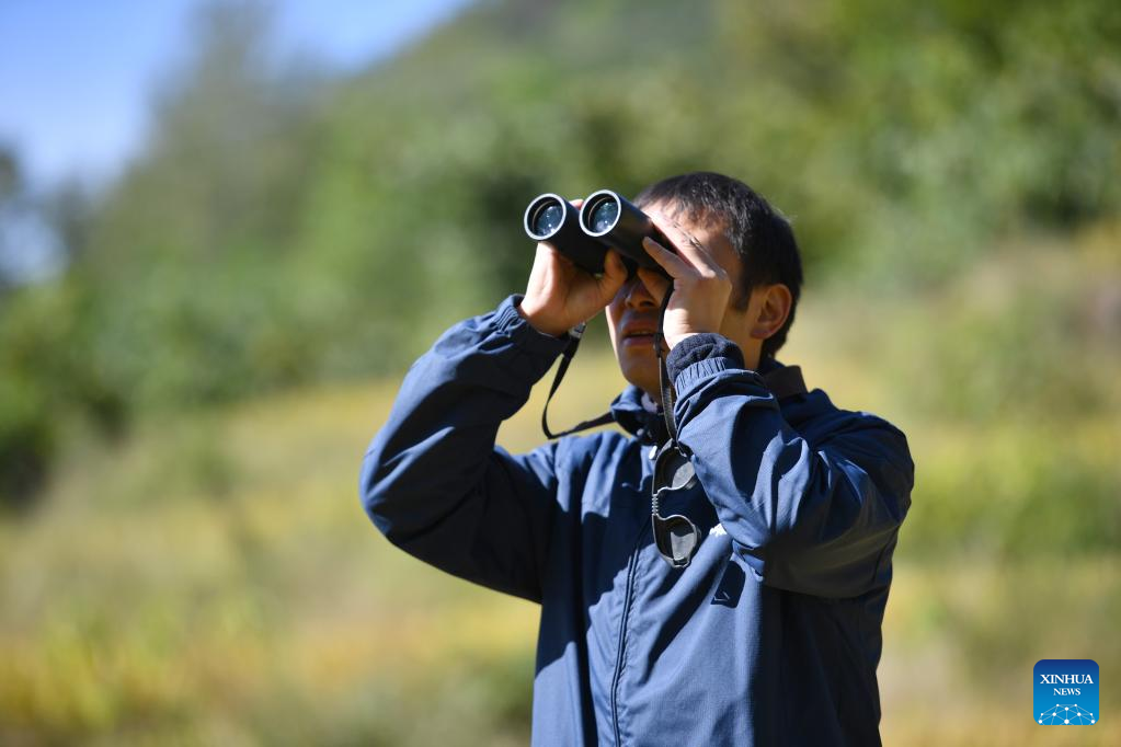 Li Xia, head of the management station of a crested ibis feralization base, monitors the daily activity of the crested ibises in Ningshan County, northwest China's Shaanxi Province, Oct. 10, 2022. In recent years, Ningshan County has made great efforts in ecological protection and green development, with local forest coverage rate reaching 96.24 percent and the population of crested ibises, giant pandas and golden snub-nosed monkeys growing. (Xinhua/Shao Rui)