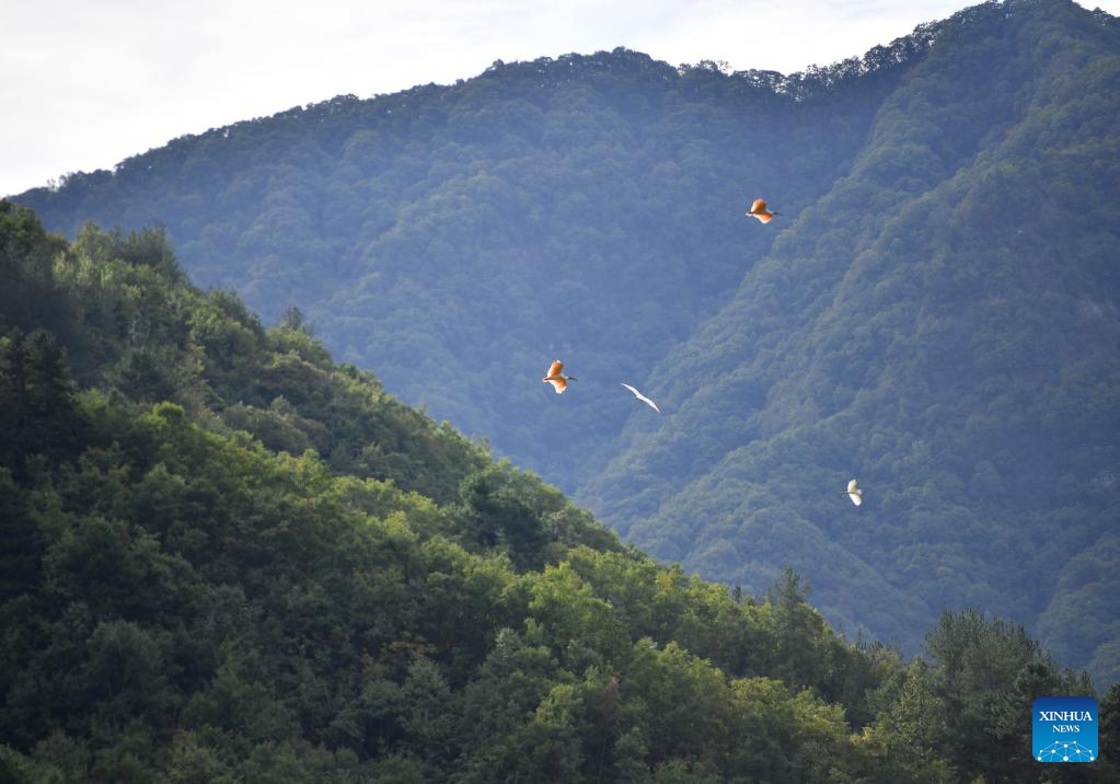 Crested ibises fly in the sky in Zhaigou Village, Ningshan County of northwest China's Shaanxi Province, Oct. 10, 2022. In recent years, Ningshan County has made great efforts in ecological protection and green development, with local forest coverage rate reaching 96.24 percent and the population of crested ibises, giant pandas and golden snub-nosed monkeys growing. (Xinhua/Shao Rui)