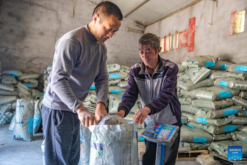 Staff members unpack fish feed at a cold-water fish farming base in Ming'an Village, Liaozi Township, Chengkou County, southwest China's Chongqing, Oct. 11, 2022. Taking advantage of the ecological resources, cold-water fish farming in Liaozi Township has become a distinctive local industry and increased the villagers' income. (Xinhua/Huang Wei)