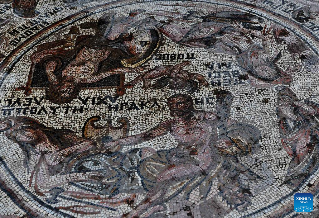 Photo taken on Oct. 12, 2022 shows part of a Roman-era mosaic panel in al-Rastan, Homs, Syria. A well-preserved Roman-era mosaic panel was discovered in a residential suburb in the Syrian central province of Homs, local antiquities authorities announced on Wednesday. (Photo by Ammar Safarjalani/Xinhua)